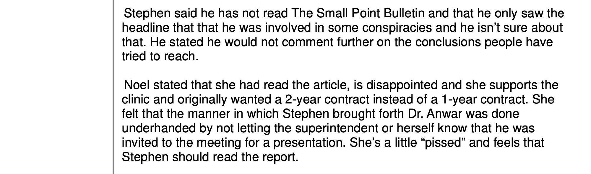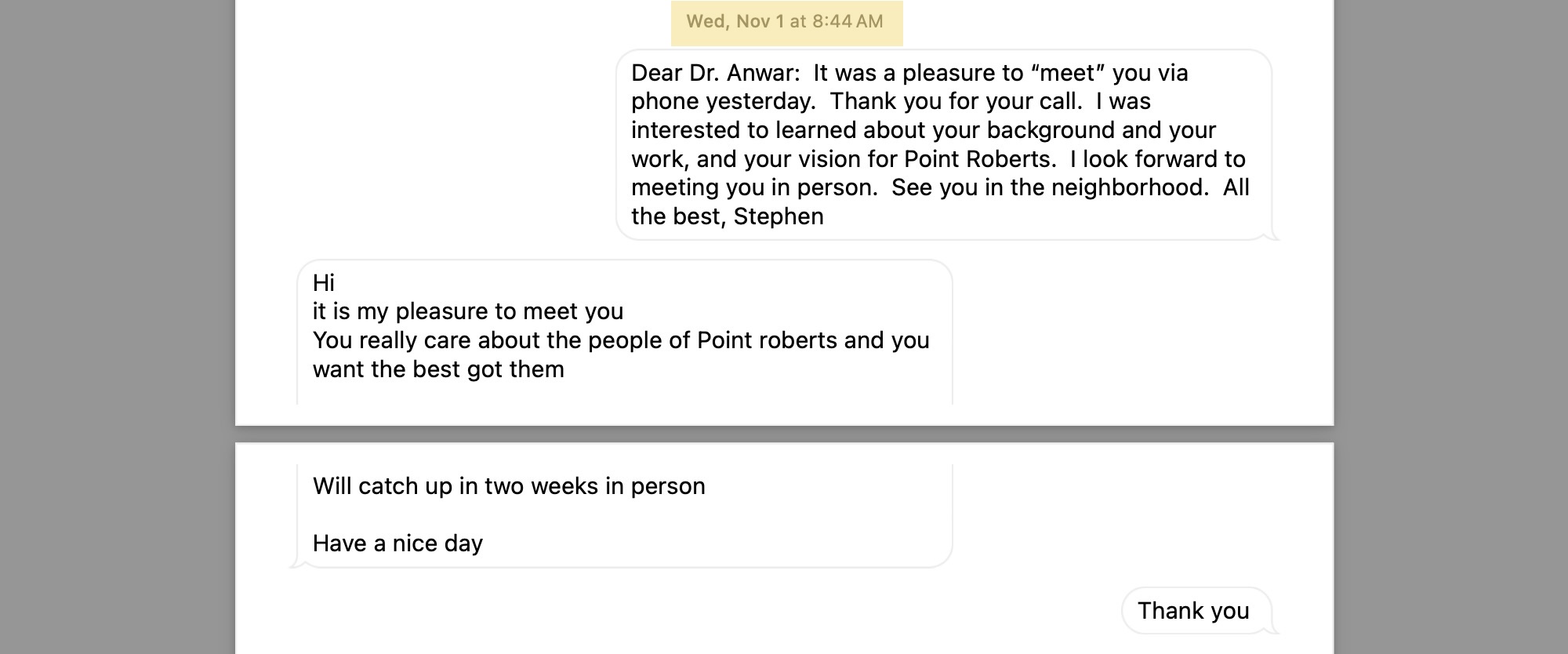 Two weeks after this exchange, on November 14, Anwar applied to vote in Whatcom County and the other PA on his team, Jessica VanderWilp who currently practices with him in Phoenix, applied for her license to practice in Washington State. Two days later on the 16th, Anwar and Stephen met for lunch. It would be three more months before Anwar would introduce himself at a public meeting. Falk did not disclose his ongoing involvement with Anwar.