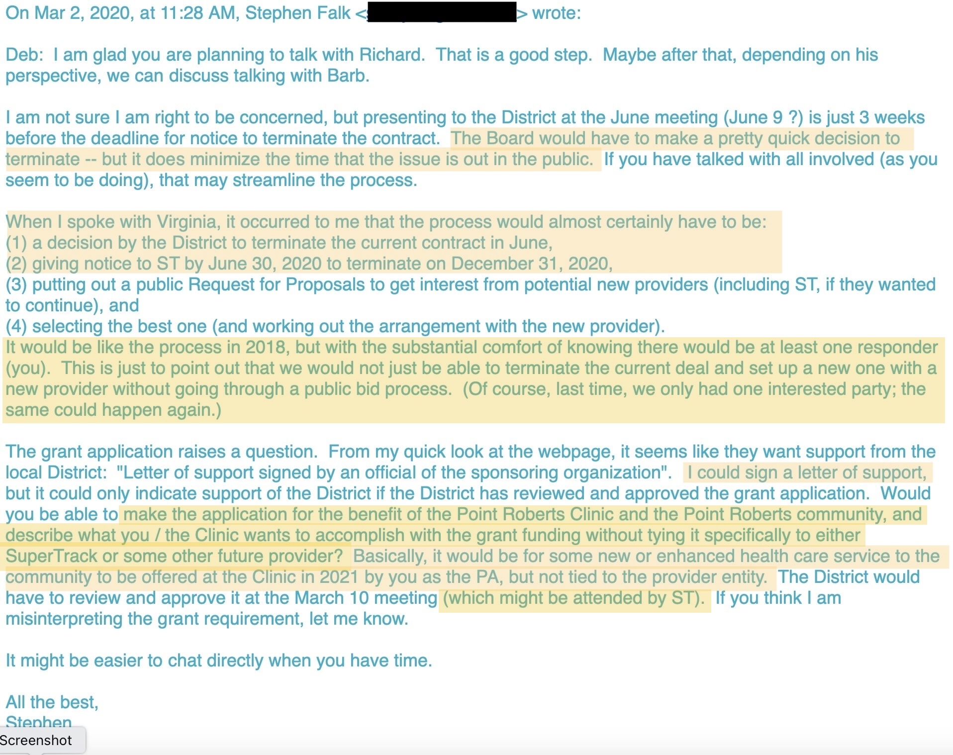 In this email, Falk suggests that Deb Shields mislead the other commissioners, the superintendent, SuperTrack, and a granting agency about the nature of her 2020 proposal to take over the clinic: