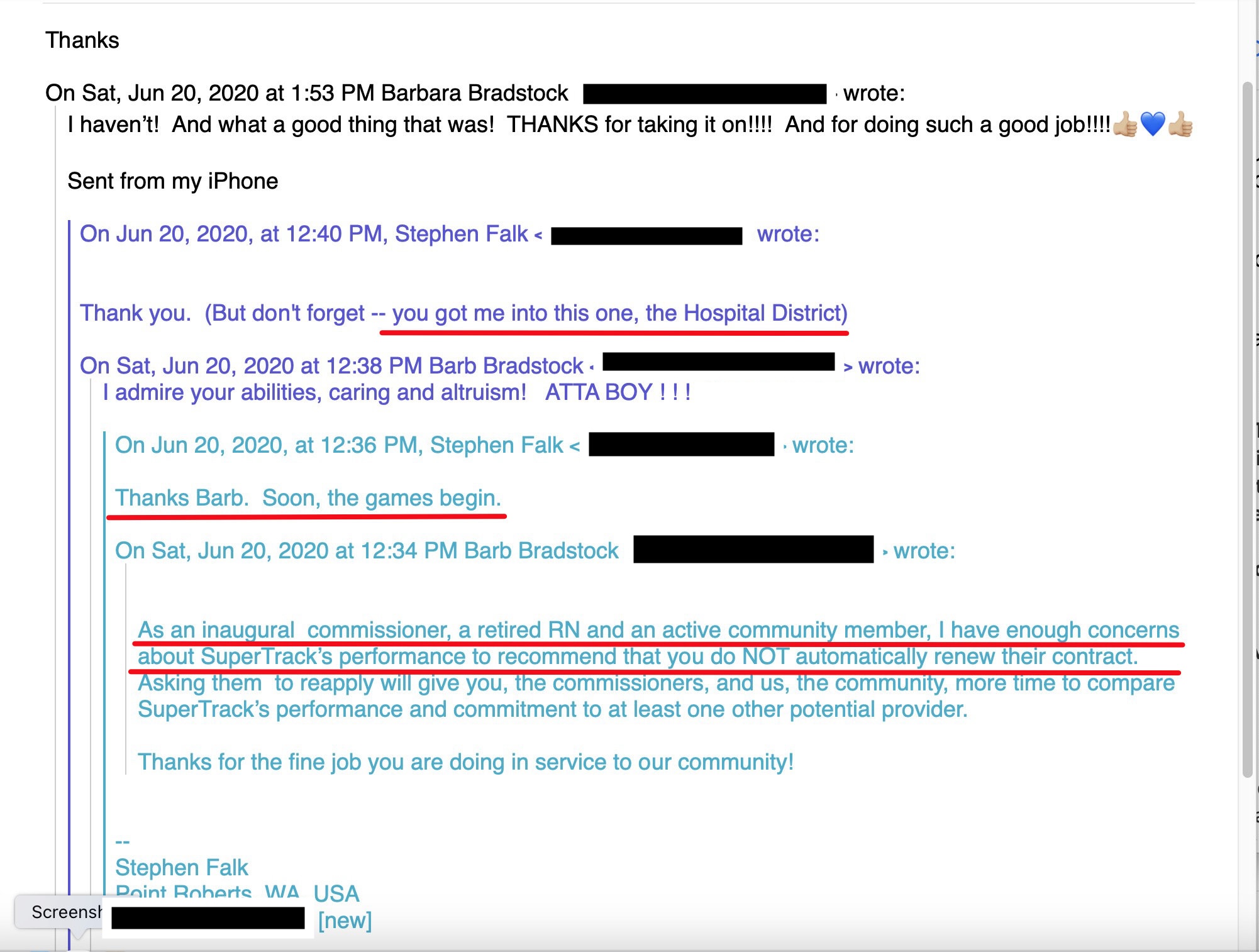 On June 20, 2020, two weeks after Deb Shields was fired for betraying SuperTrack and a few hours before the Hospital District Board would meet to consider whether to terminate SuperTrack's contract in order to open the door for Deb Shields' proposal, Barb Bradstock wrote to Stephen Falk. Since this is an email thread, read from the bottom up:
