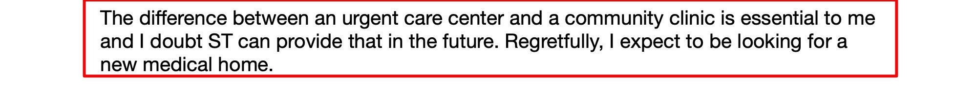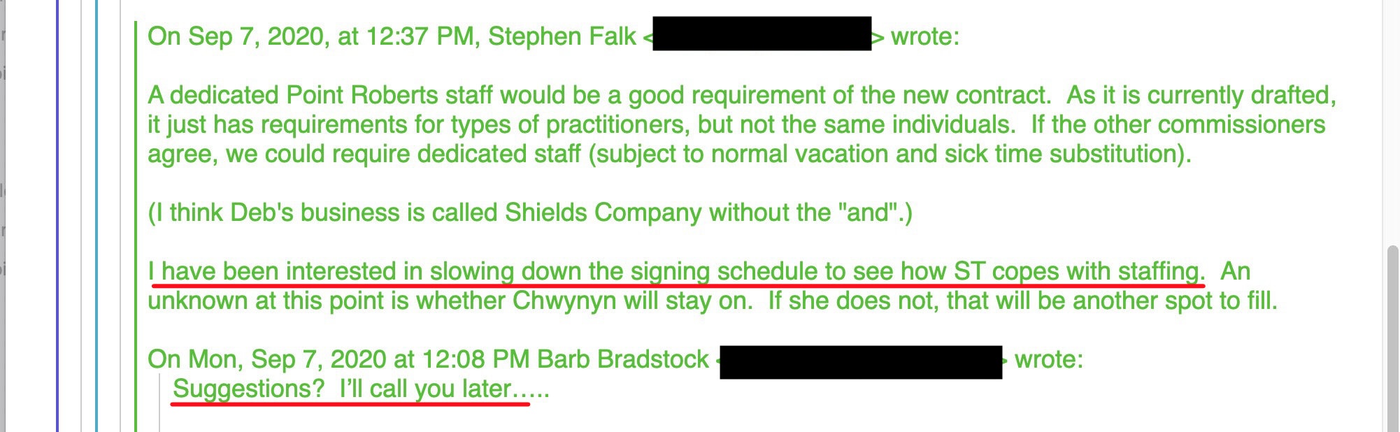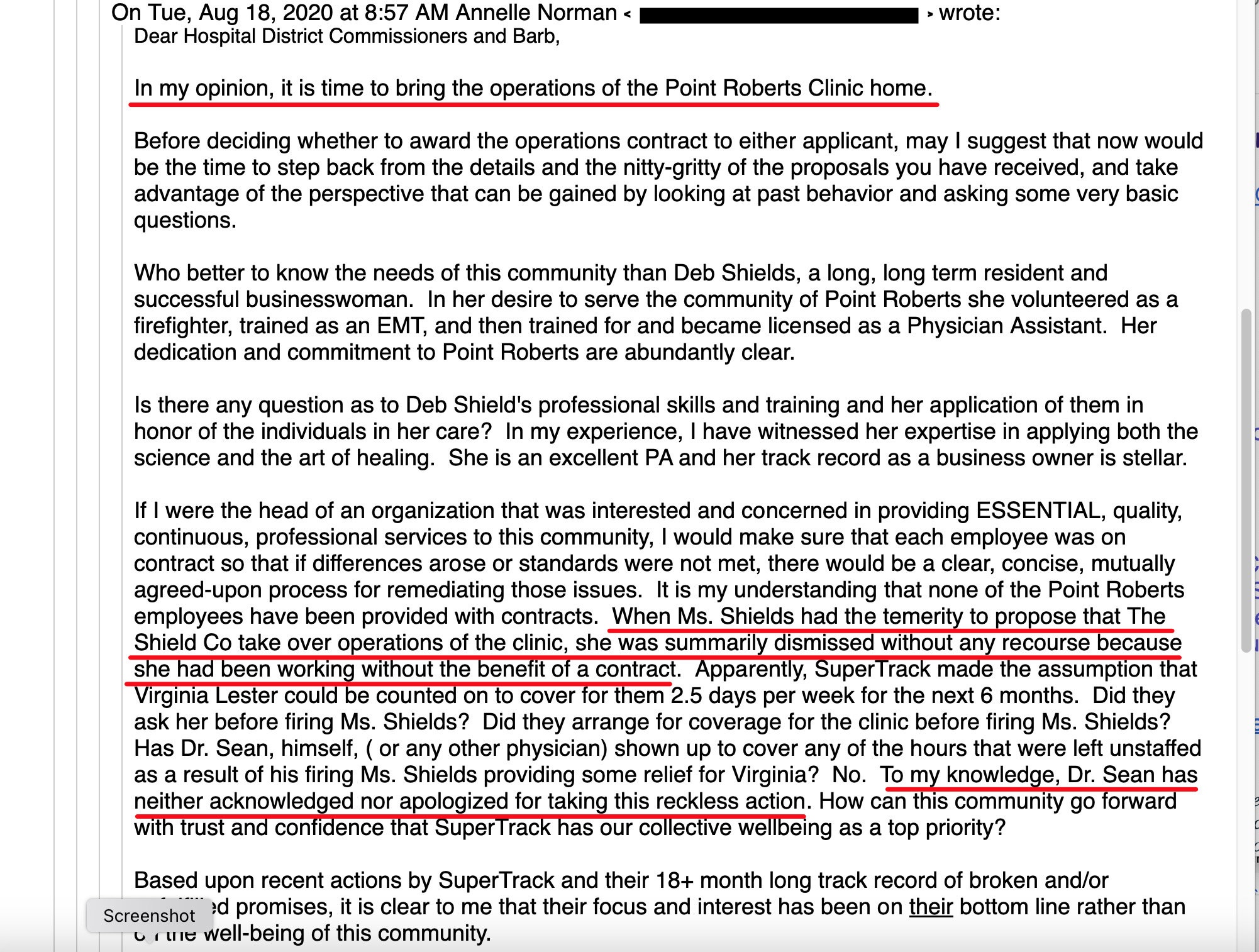 On September 8, 2020, following the board's August vote to continue with SuperTrack and just before the next district meeting, Barb Bradstock again wrote the commissioners, repeating the themes made by Stephen at the August meeting: PAs are as good as doctors, an urgent care model isn't right for Point Roberts, and keeping it local: