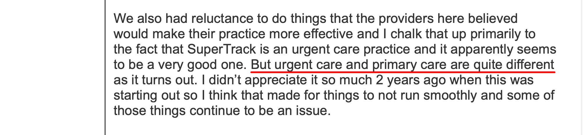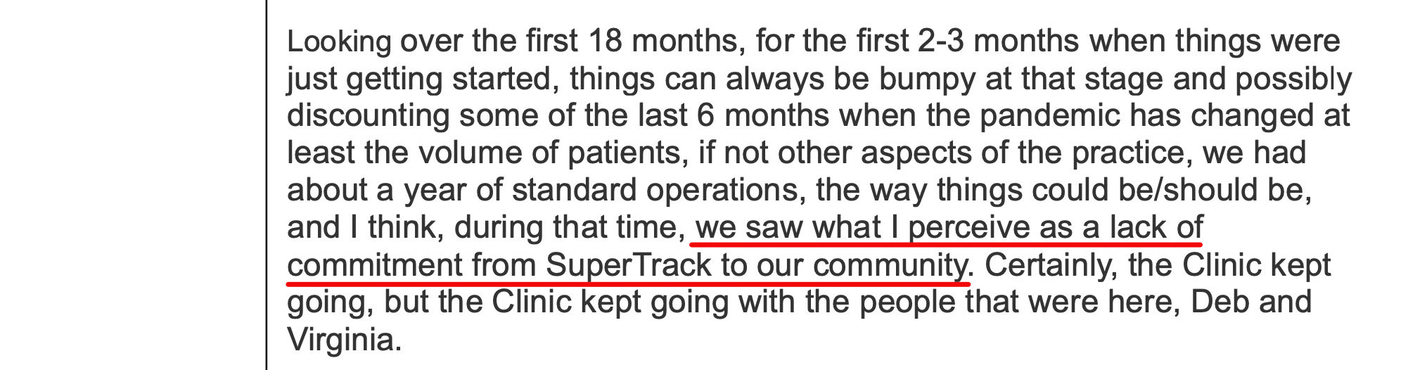 SuperTrack at Point Roberts has never been just an urgent care practice. From the beginning, they have provided a combination of family practice and urgent care. They've demonstrated their commitment to the community by staffing the clinic with three extremely capable doctors, giving us stellar support through the covid border shutdown, and continuously improving their services well beyond the requirements of the contract.