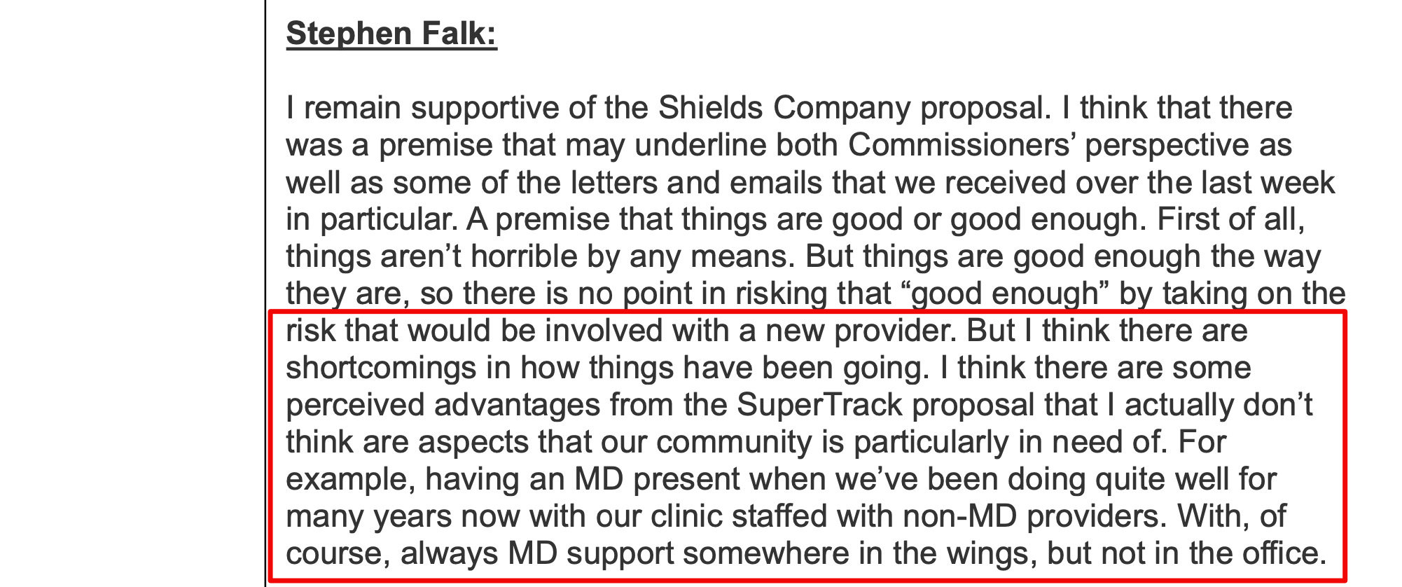 From the approved minutes of the August 18, 2020 meeting, commissioner Stephen Falk explained why he prefers Shields to SuperTrack. The themes are: PAs are as good as doctors, SuperTrack isn't committed to the community, and an urgent care model isn't right for Point Roberts: