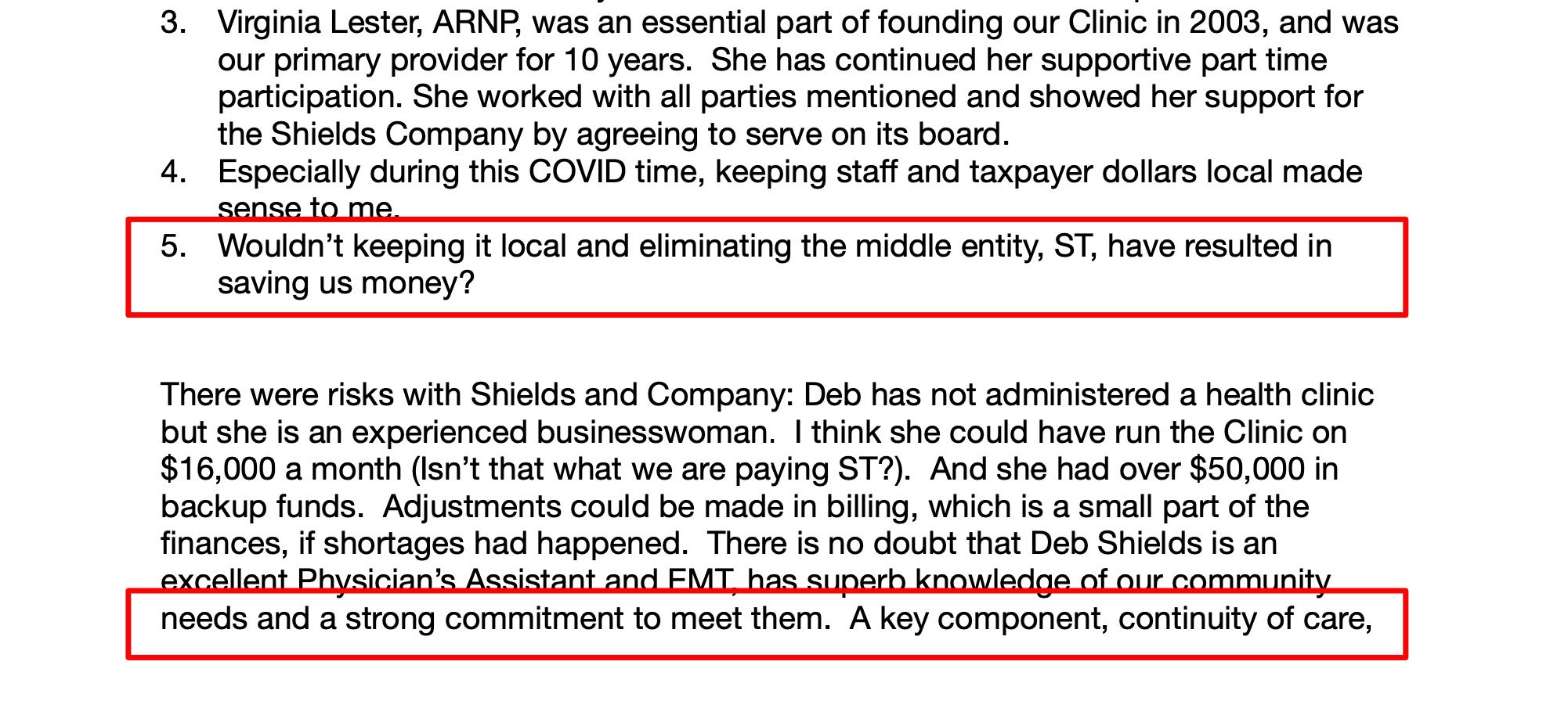Dr. Sean objected to this departure from the normal procurement process and to being confronted with yet another surprise attempt by Shields to take the clinic contract. The approved meeting minutes say, “John Anwar and Deborah Shields are wanting to put in a proposal” to operate the clinic. The full meeting minutes can be found here.