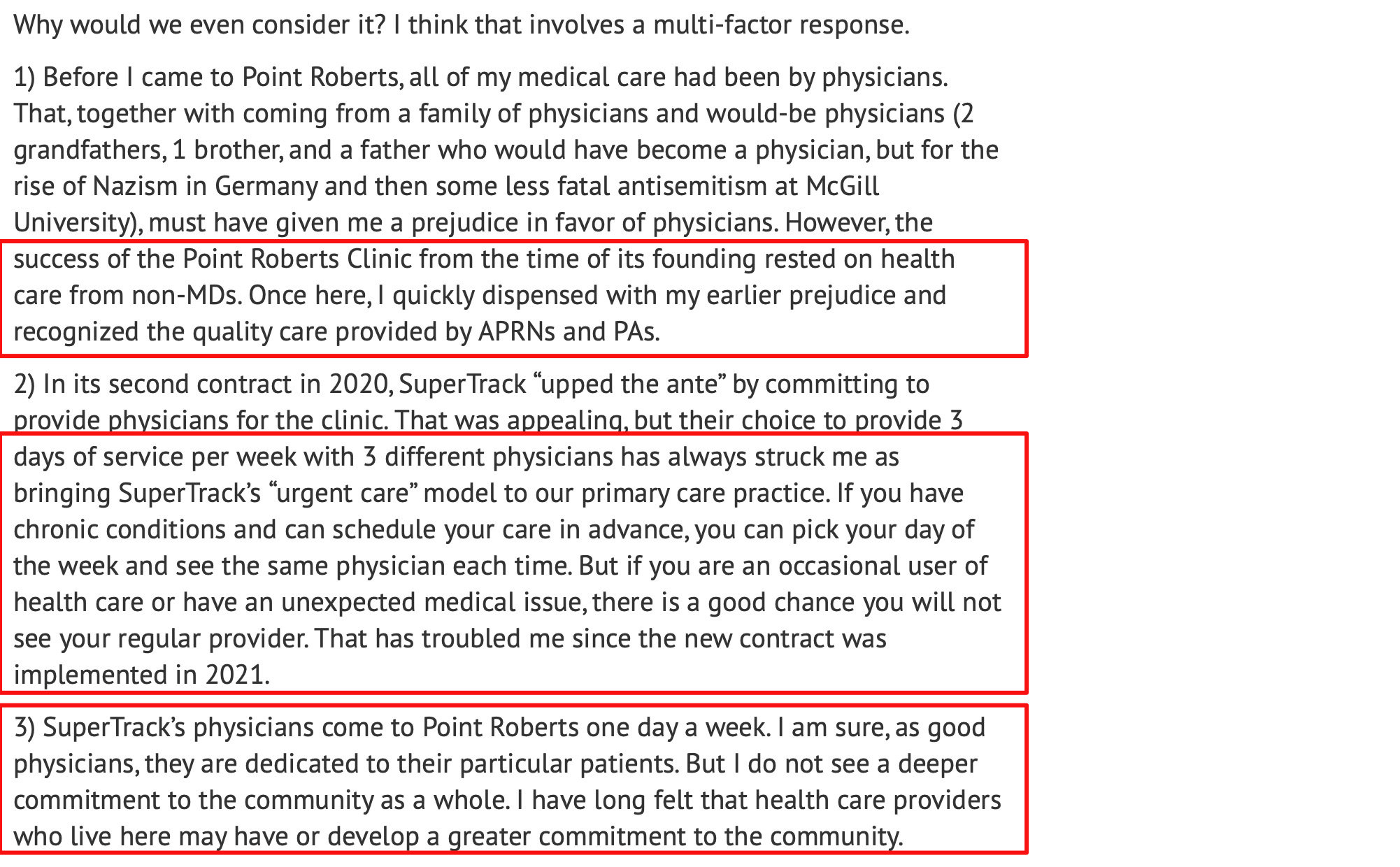 But despite the last four years of evidence to the contrary, Stephen repeats the same talking points from the past in his recent interview with Pat Grubb. The themes remain the same: PAs are as good as doctors, an urgent care model isn't right for Point Roberts, and SuperTrack isn't committed to the community: