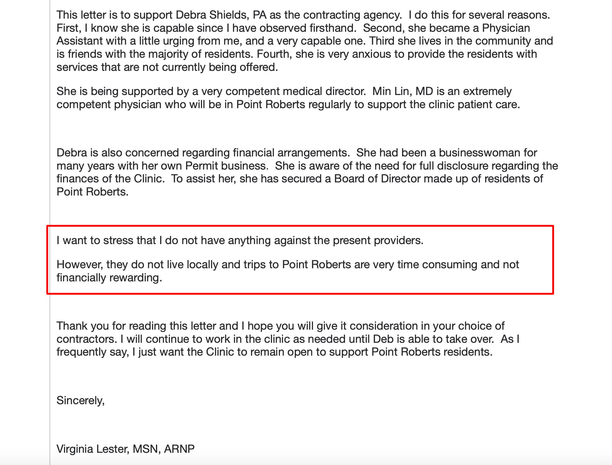 Once again, I apologize for my errors in judgment and will continue to bring the Point Roberts Community the highest level of health care possible.