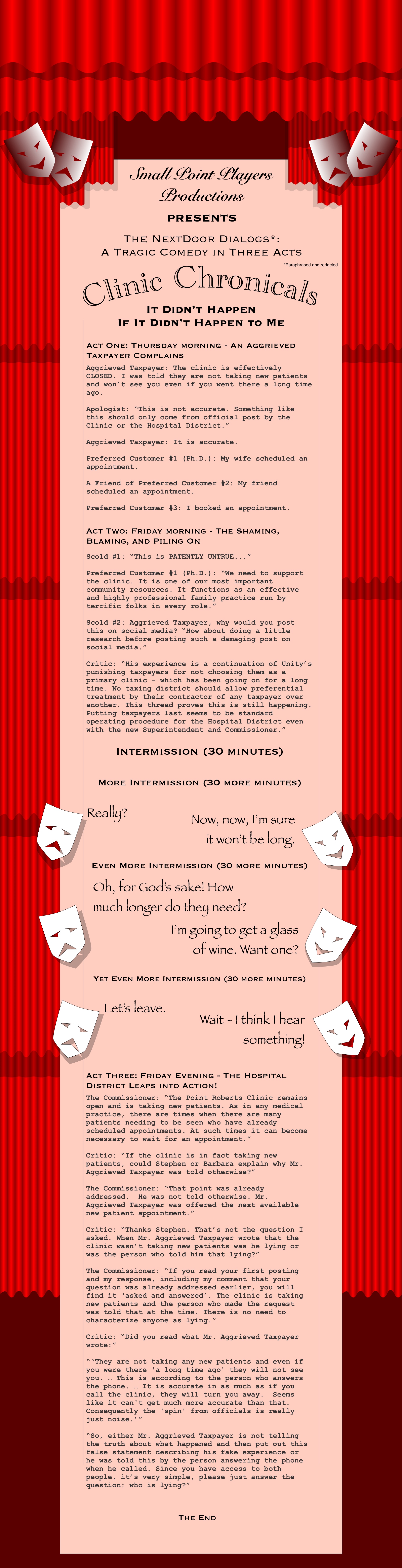 You can find the whole (non-paraphrased) exchange at NextDoor. It's a perfect illustration of how differently people are treated at the clinic, and of how clueless those who are treated well there are about those who are not. It's also a sad commentary on the Hospital District who had to be shamed into commenting, took a day and a half to do so, and then deflected by answering a question that wasn't asked, and not answering the question that was.