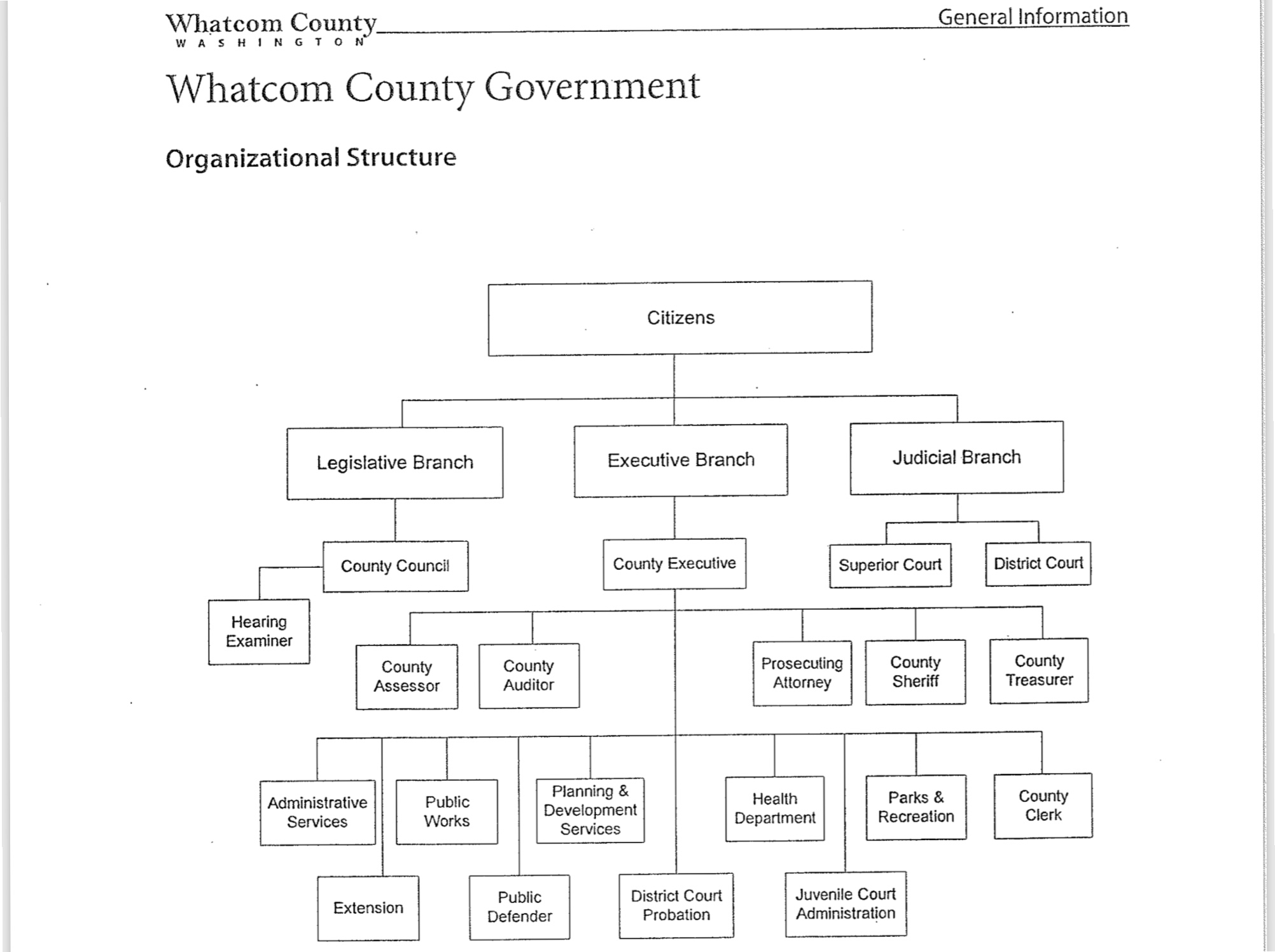 Here's Whatcom County's idealized organization chart, from their web site. Note that they put "citizens" at the top, recognizing that county public servants work for the citizens: