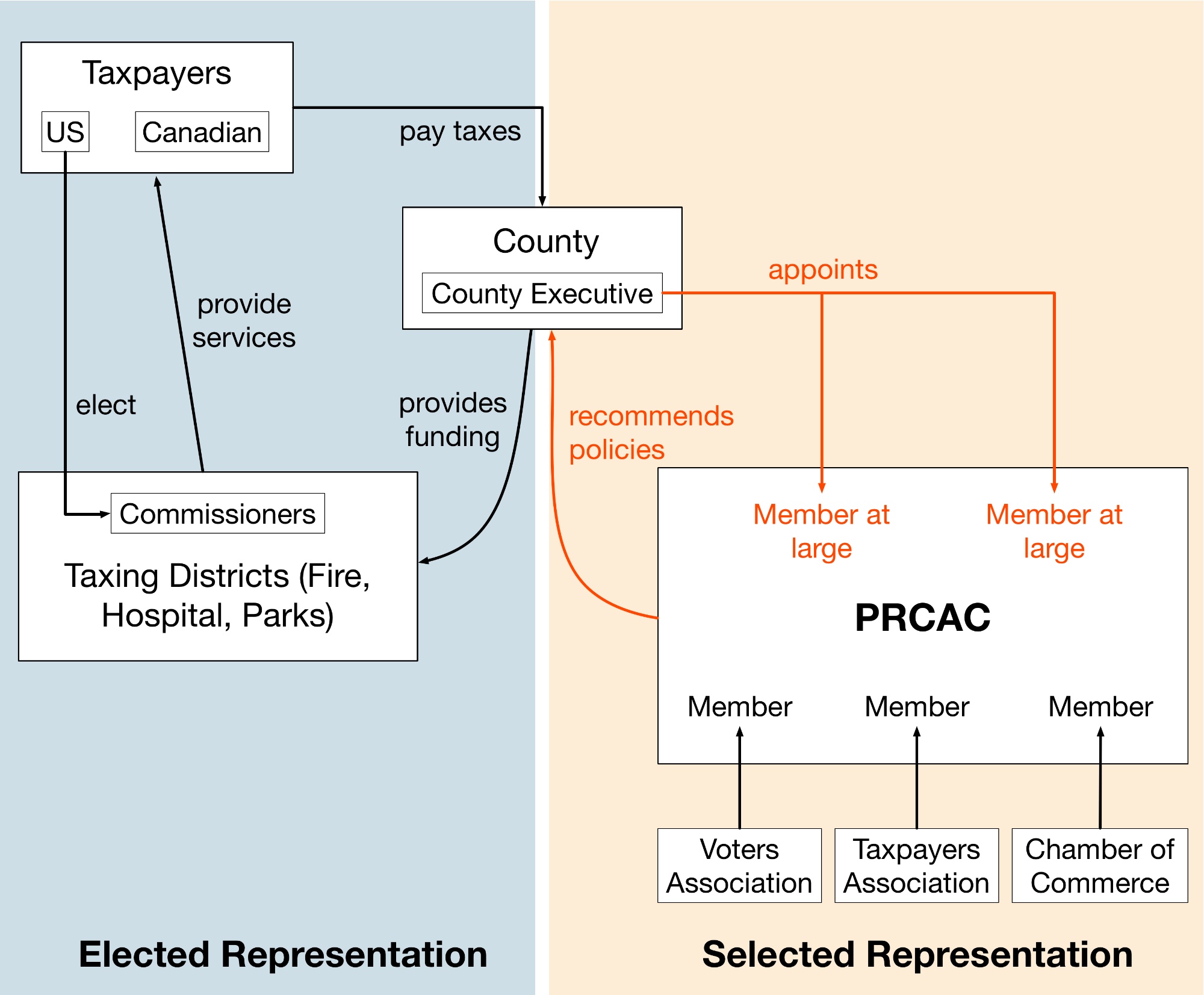 The diagram above shows the flow of money and authority between the county, the taxing districts, the taxpayers, local community groups, and the PRCAC. Note that the left side of the chart depicts "elected" representation while the right side is "selected" representation. It's "selected" because: