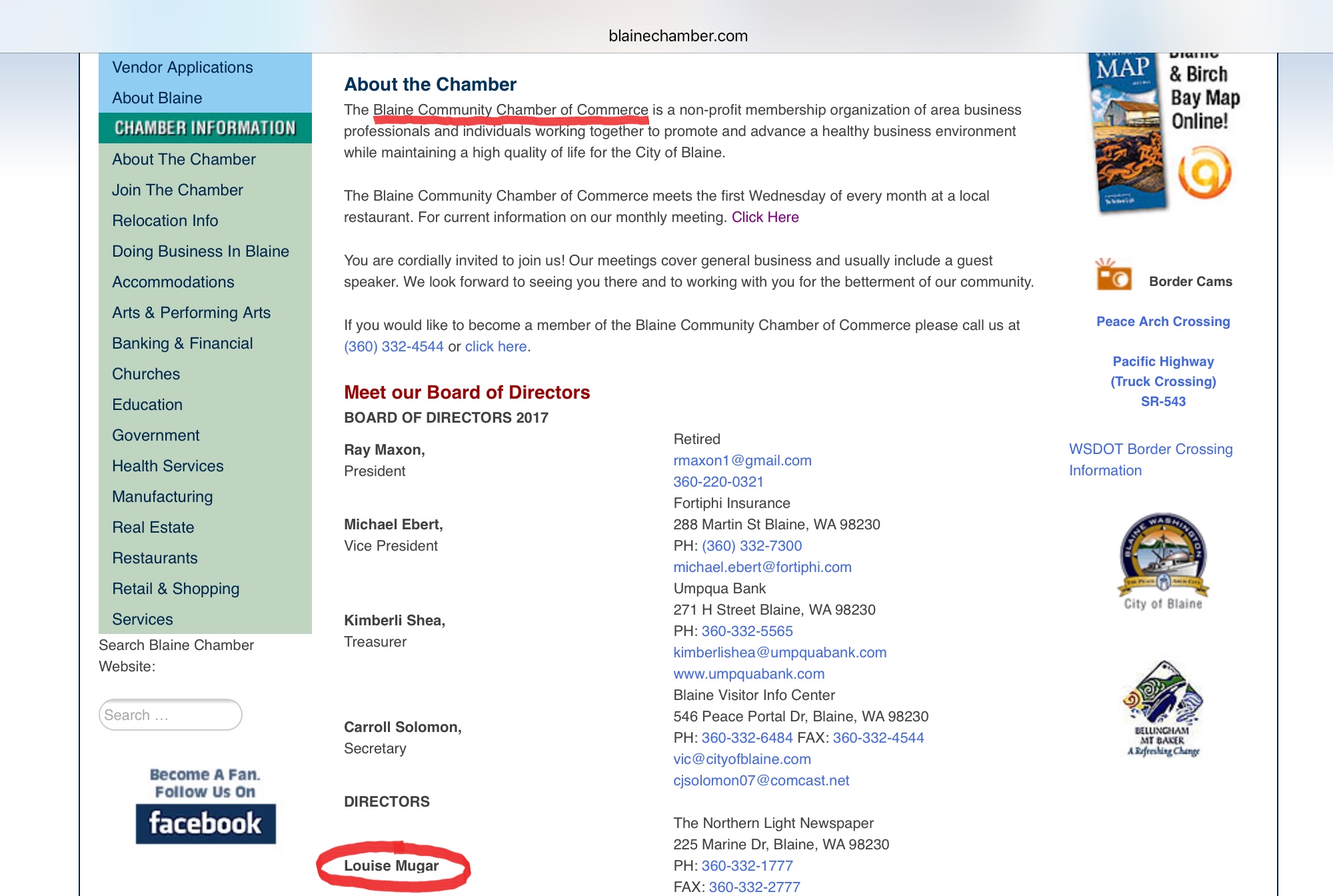 One might expect that the Point Roberts Chamber of Commerce would represent, you know, Point Roberts businesses. But the Point Roberts Press is actually a Blaine business. In fact, Louise Mugar Grubb is also listed as a Director for the Blaine Community Chamber of Commerce on that organization's web site: