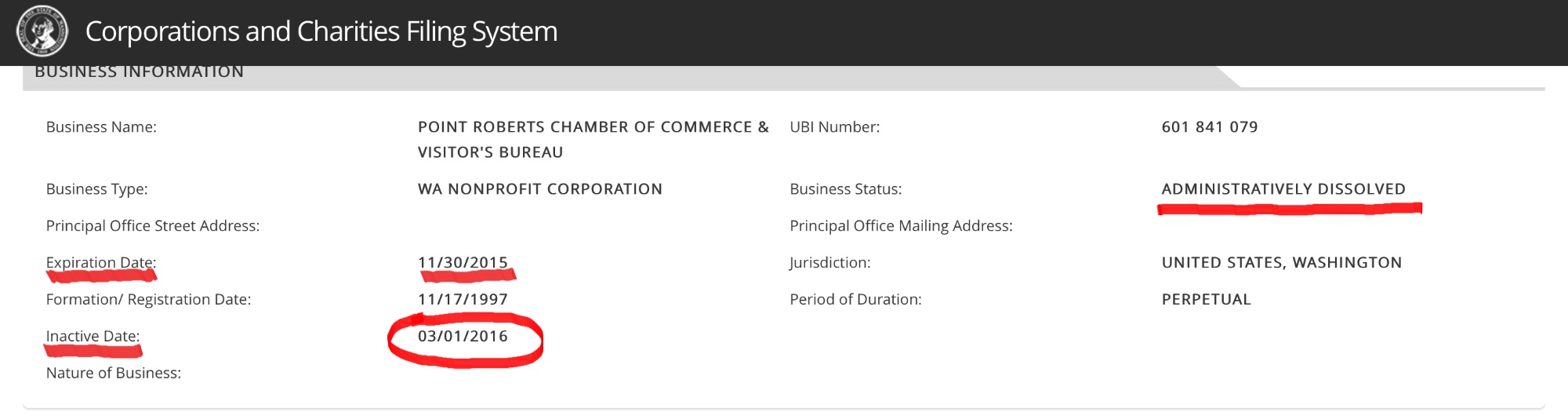 A new group in town, the "Point Roberts Independent Business Council", has circulated a letter introducing themselves. Their letter outlines their issues, and at the end, they point out that "the Point Roberts Chamber of Commerce (PRCOC) is no longer recognized by the Washington State Secretary of State as a legal entity in good standing, as the organization was 'administratively dissolved' in 2016.”