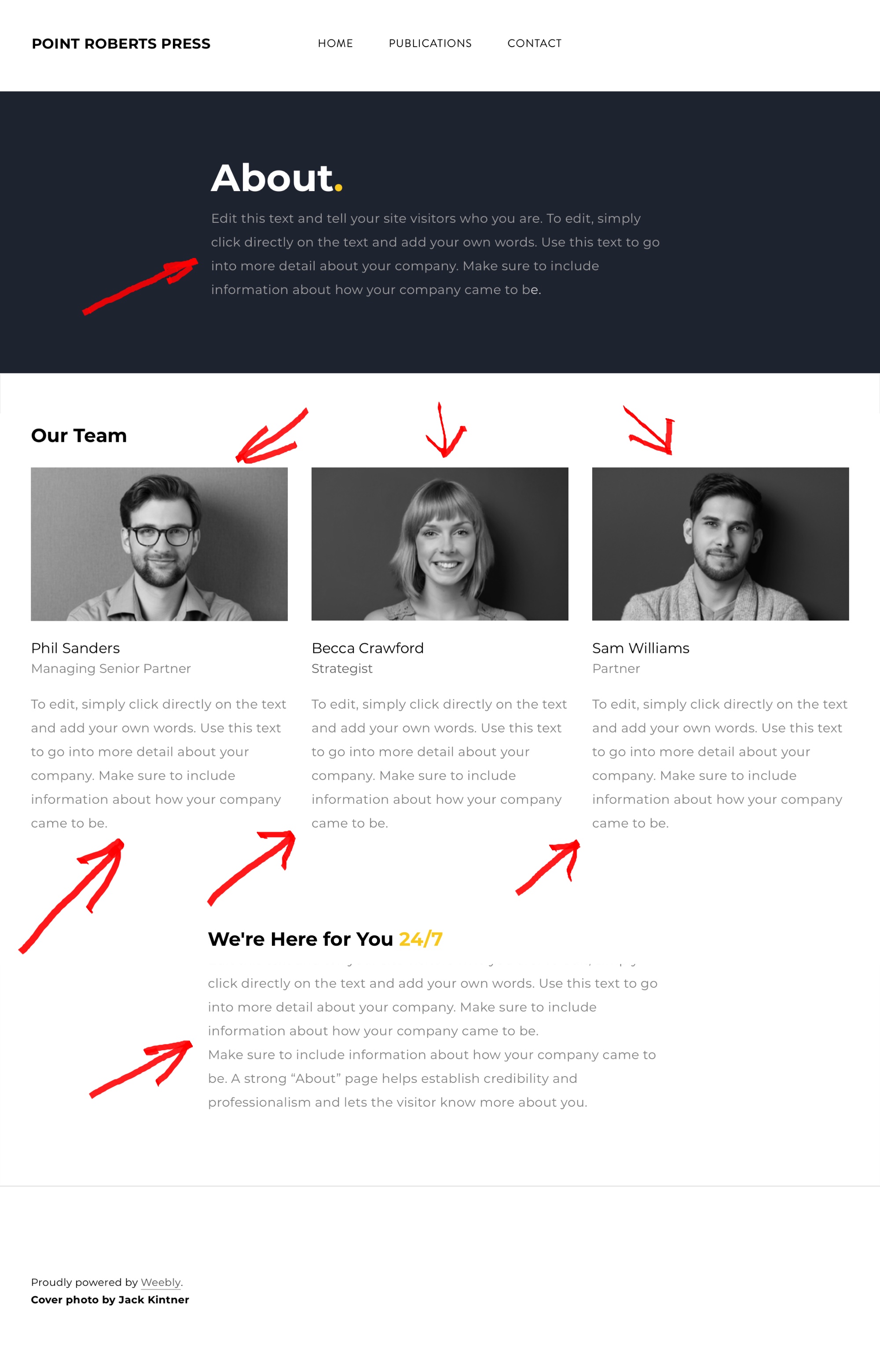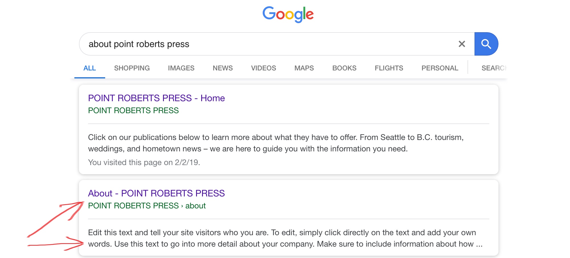 Rather than build their own web site, the Point Roberts Press uses a template-based service, and their web designer never bothered to fill out the About Us page on the template they're using or remove it from the site so it wouldn't be reachable. You can even find it through Google: