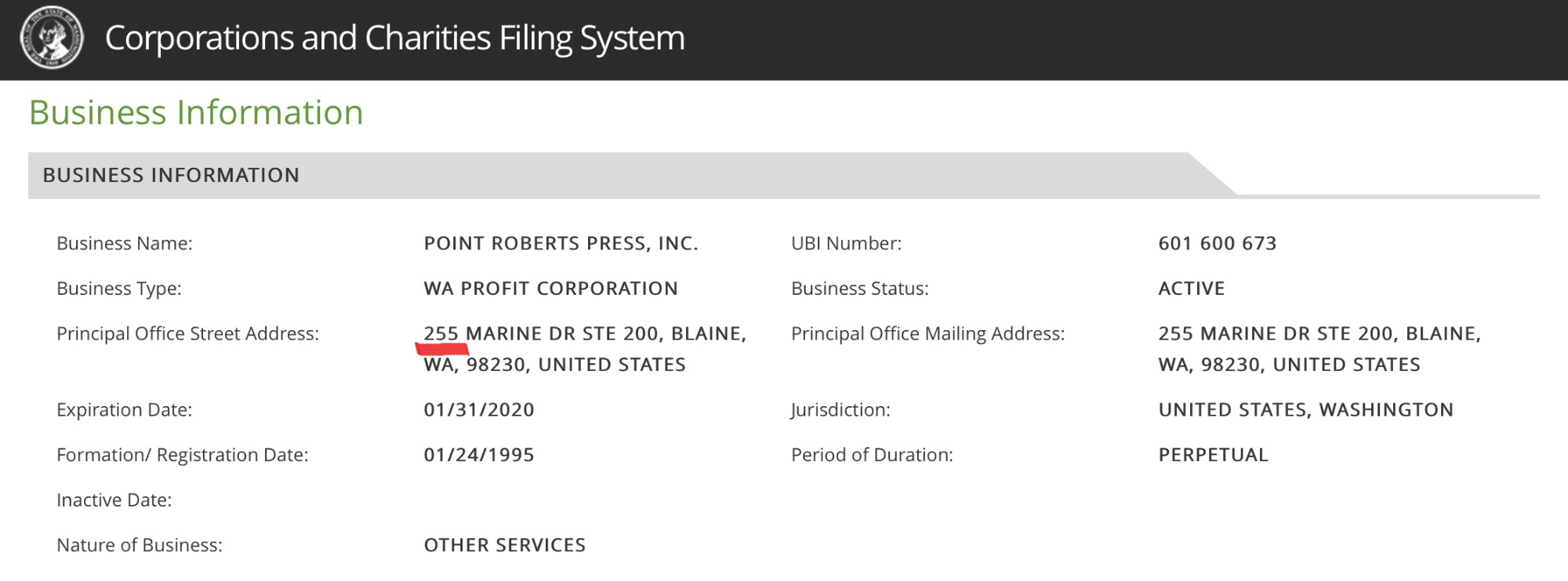 Coincidentally, like the Point Roberts Chamber of Commerce, the Point Roberts Press also has an issue with their Secretary of State registration. Here's their street address from their web site: