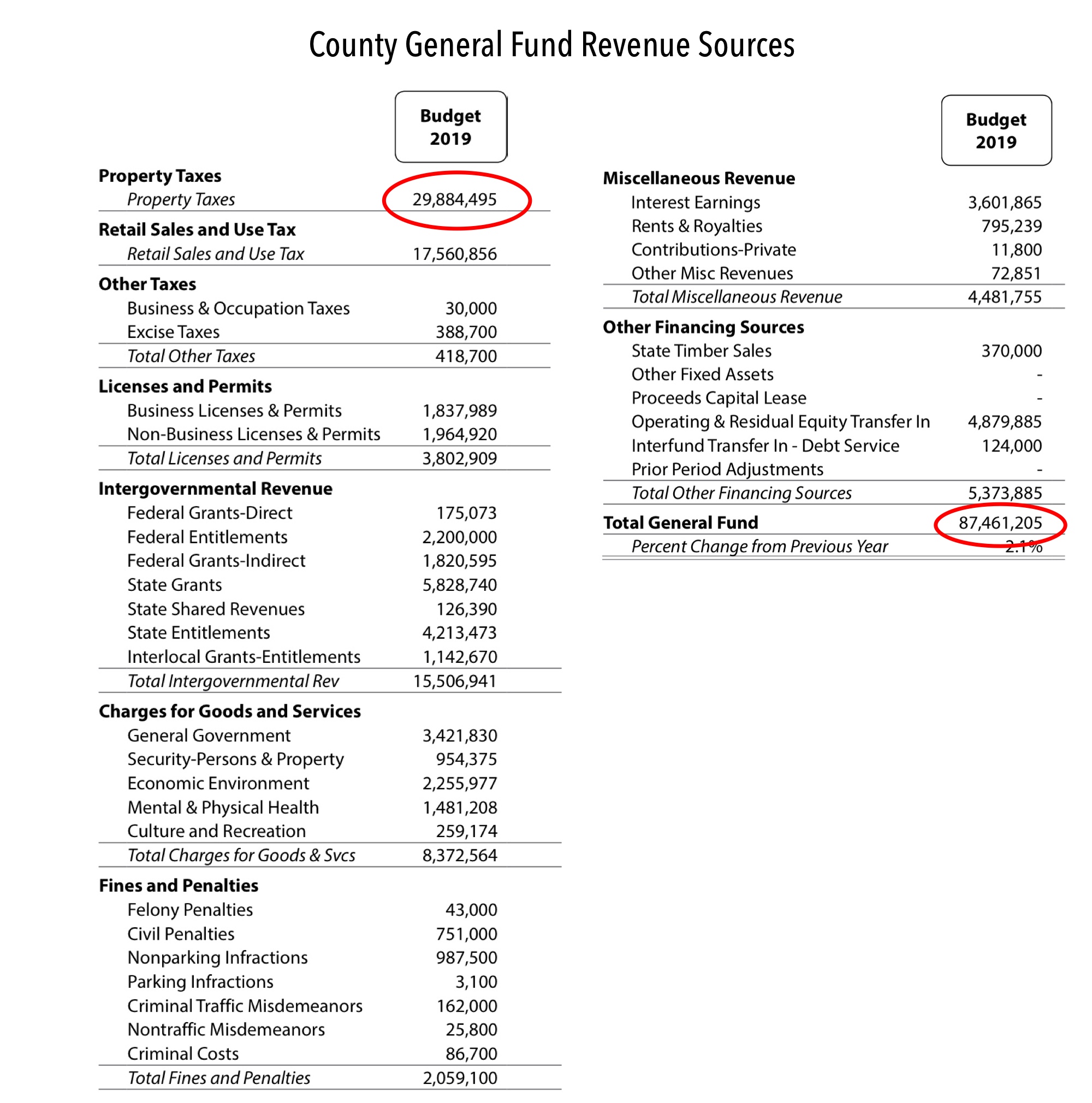 About a third of the county general fund revenue comes from property taxes. The other two-thirds come from other sources. So property taxes cover just a third of the services we receive from this general fund.