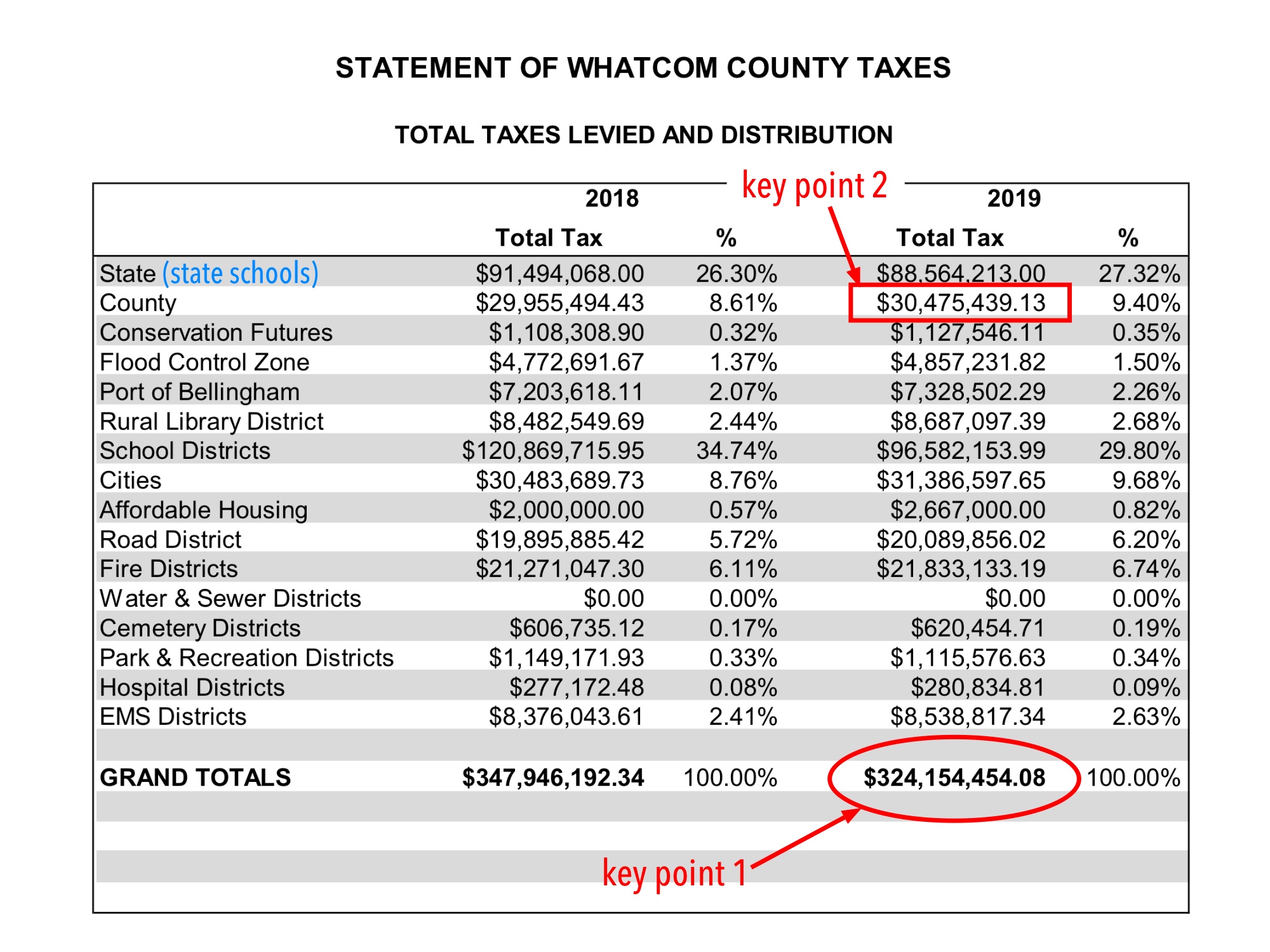 These are all the property taxes levied for all of Whatcom County by fund, from the Whatcom County Assessor's Tax Book 2019. We denote key points, which are explained below: