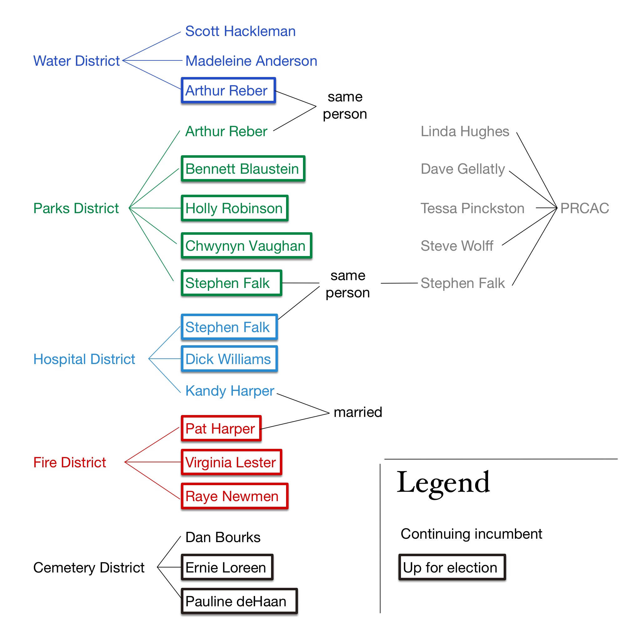 All of this clearly shows that you don't need to know medicine to be on the Hospital District board, fire fighting to be on the Fire board, parks maintenance to be on the Parks board, or water systems to be on the Water board. And you don't need to be dead to be on the Cemetery board. What you do need, for all of these boards, is knowledge of finance and governance, in addition to meeting all the legal eligibility requirements.