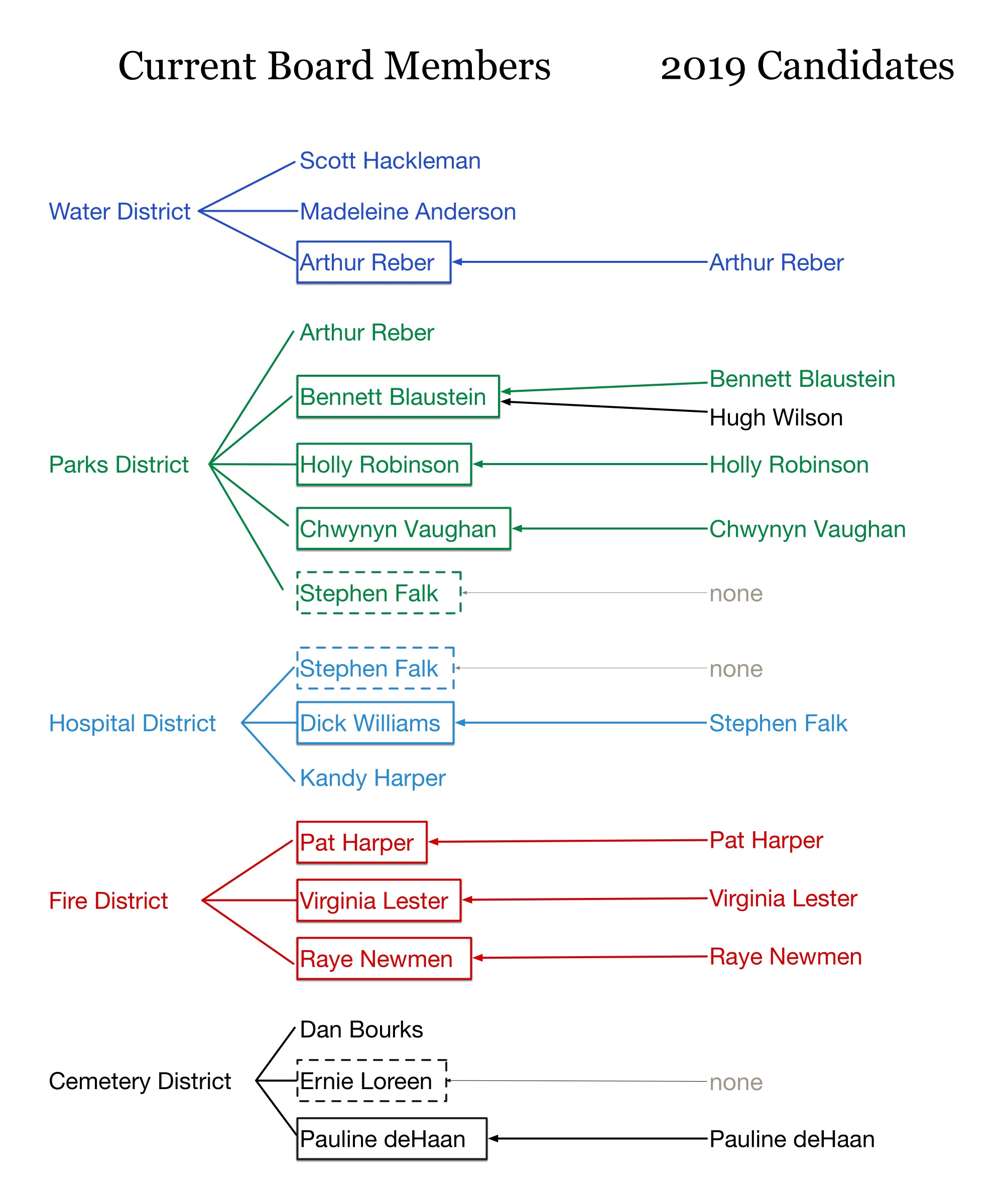 The 2019 fall election in Point Roberts is shaping up to be a hot one. At the Water Board, Arthur Reber will be fighting to keep his seat against... no one. At the Parks Board, Holly Robinson and Chwynyn Vaughan are also running unopposed. At the Hospital District, Stephen Falk will not have to fight off a challenger, nor will any of the three Fire Commissioners. And Pauli deHaan will keep her seat at the Cemetery District.