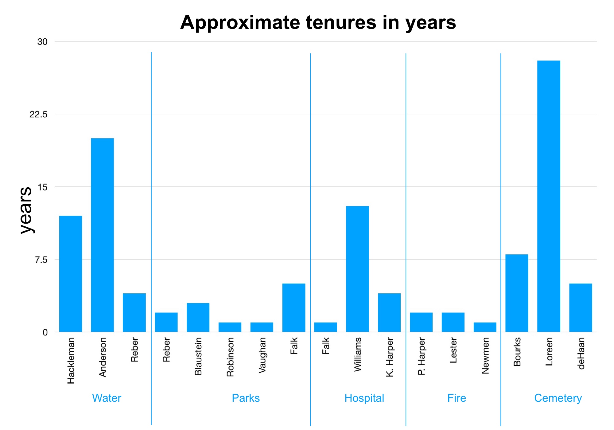 The chart below shows the approximate tenures of each official on each board based on the date each took their first oath of office through the ends of their current terms: