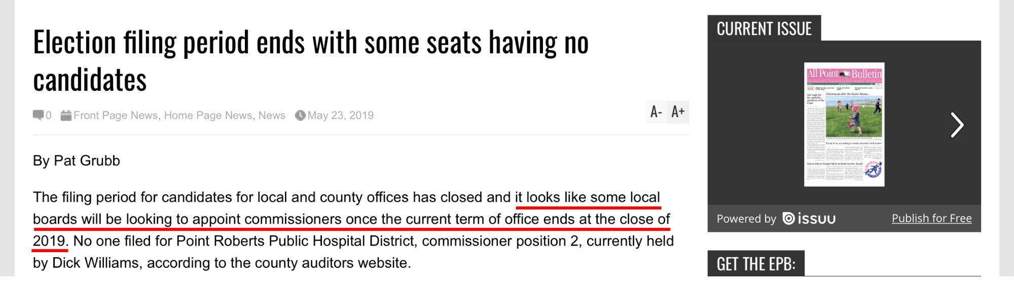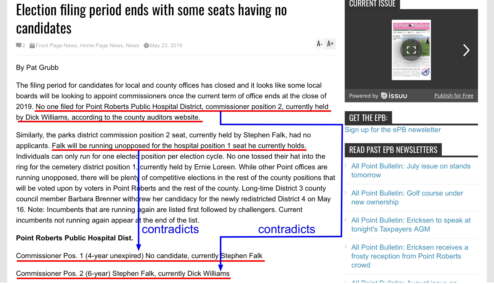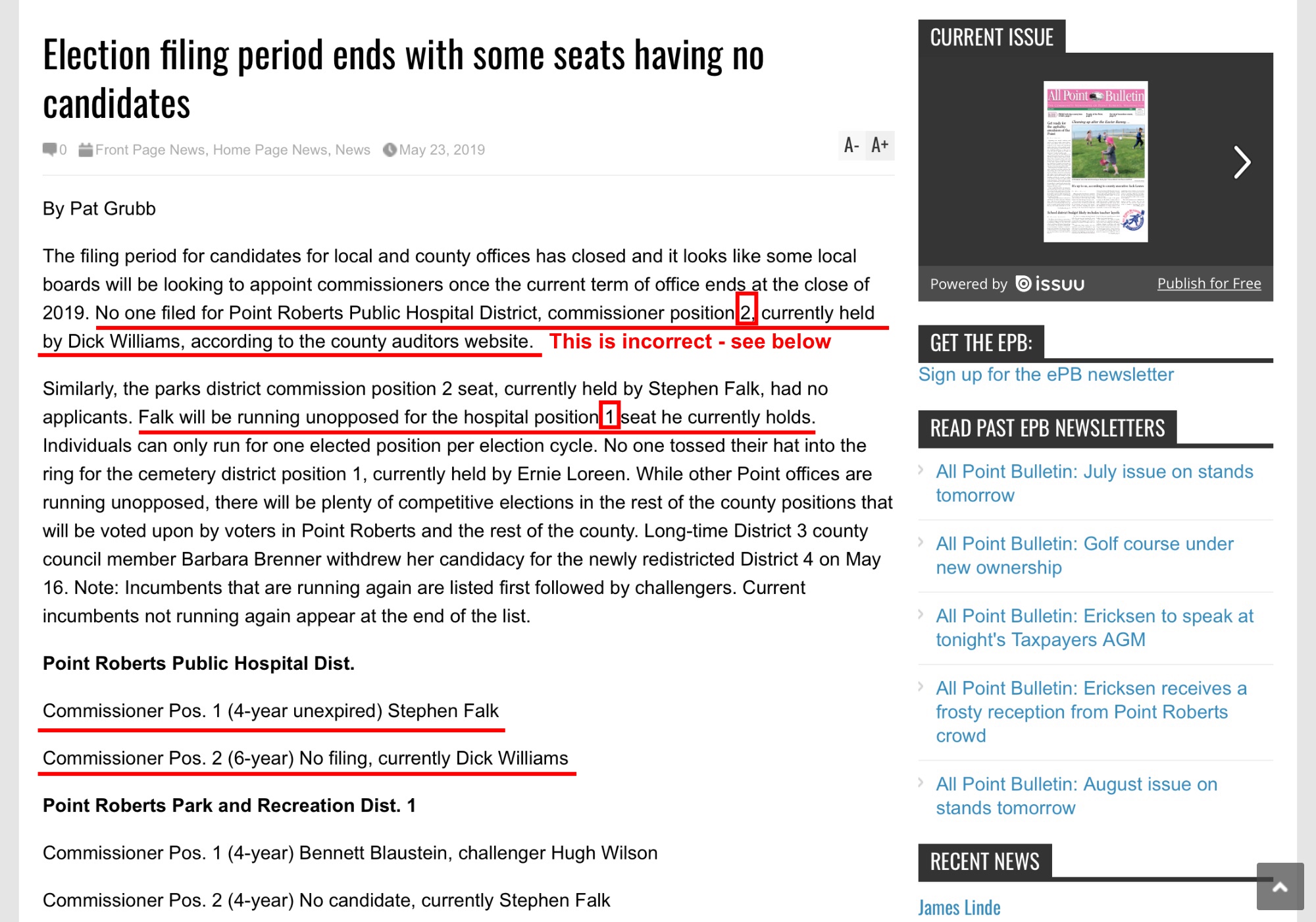 So back to the title of this edition. The candidates and remaining open positions were known on Friday, May 17. Grubb had six days to figure that out and write an accurate article. Kinda hard to believe the big, bad publisher who is not a local business but is located in Blaine would make these mistakes. Is it because he’s really busy? That’s a stretch. We know he’s still leaving two-year-old links on his home page. He sends his son to record meetings. Meg Olson writes articles based on those recordings from the comfort of her home in Coupeville. So, how could he mess up such a simple piece? Or is the question why?