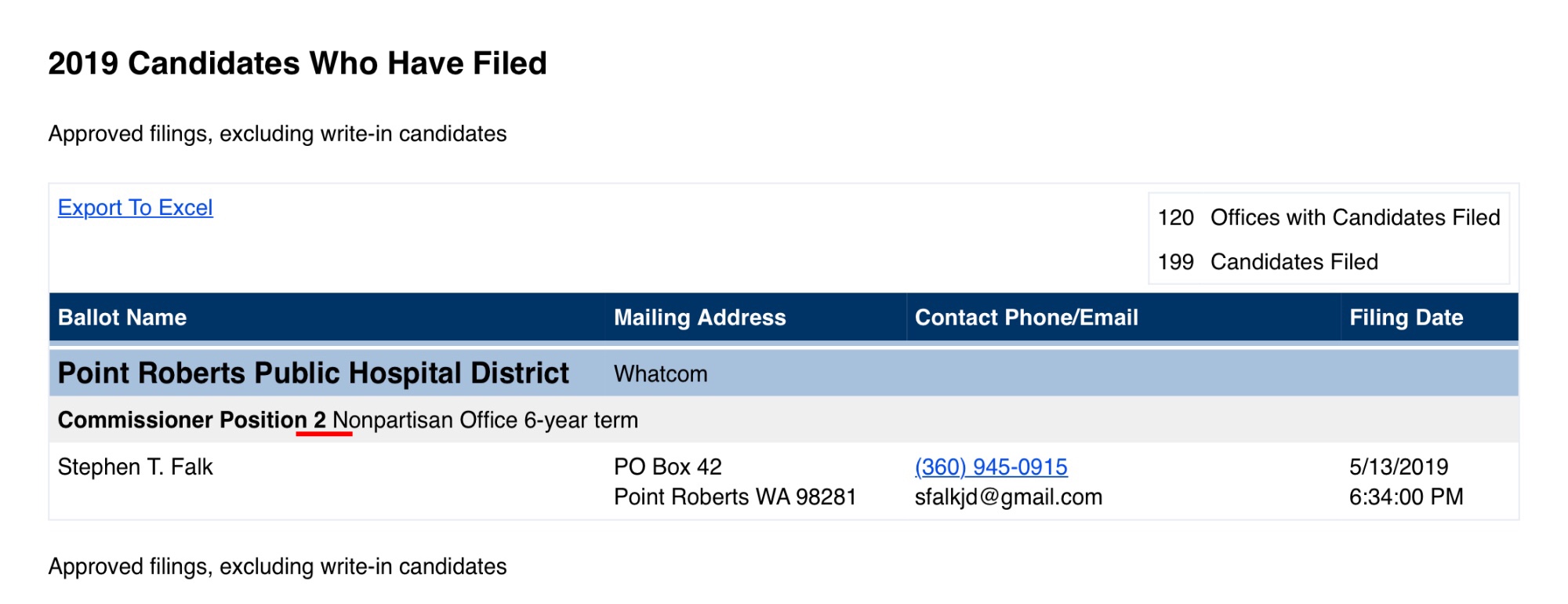 For the positions open in Point Roberts, a candidate’s name cannot appear on the ballot more than once. (RCW 29A.36.201) For this reason, Stephen Falk had to decide between running for his position on the PR Parks Board or for the Hospital District. He chose the Hospital District. But he did not choose his current seat, position 1. Why? Because that is a four year unexpired term which means he would have to run again in four years. Instead, he ran for Dick Williams' soon to be former seat (position 2) which would give Falk a full six year term on the Hospital District.