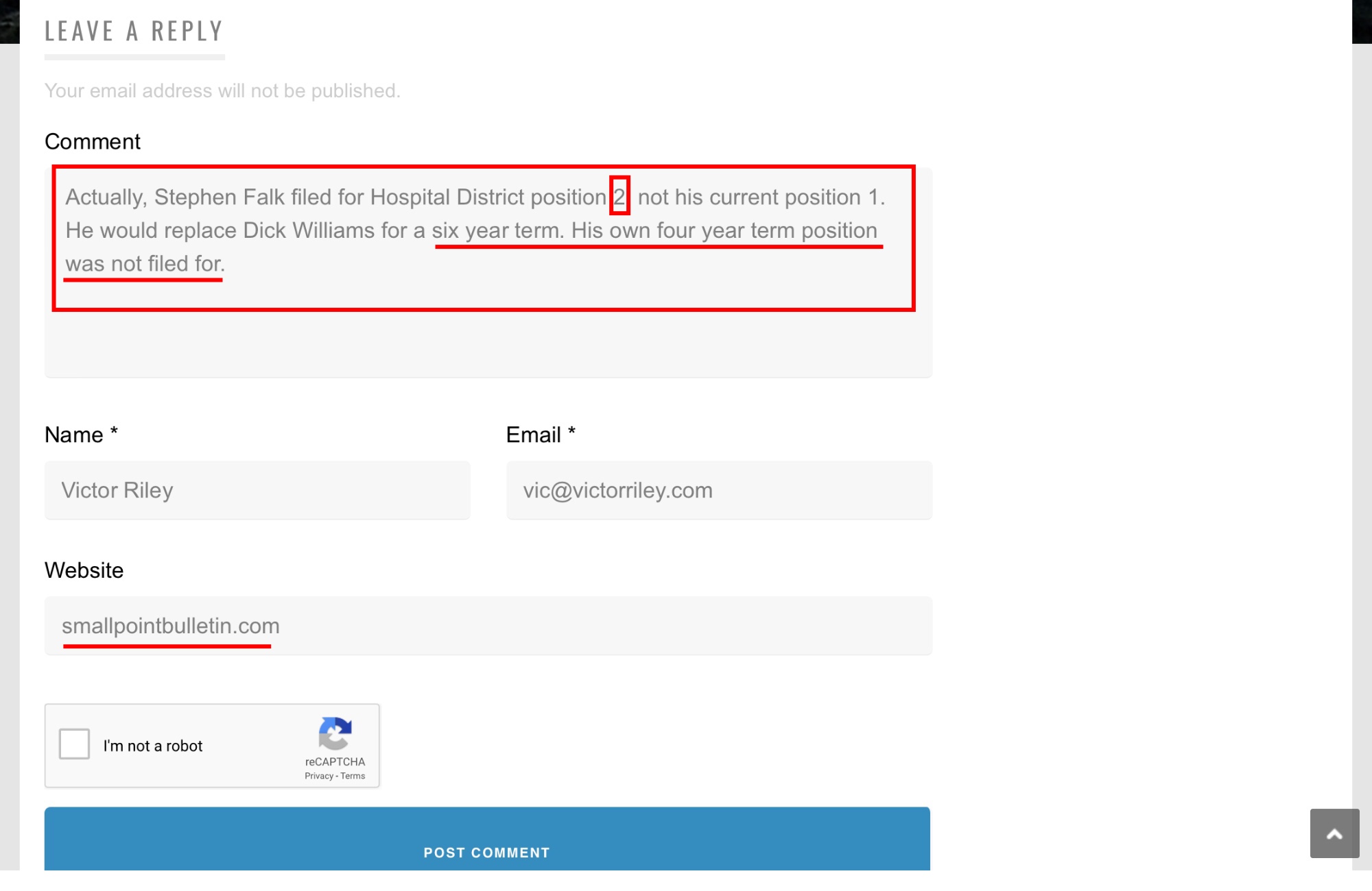 He also made an important omission and an error. This matters because the local paper should not be putting out incorrect information. Even though he does it all the time, this incorrect information is about an election and it could wrongly influence people’s decisions.