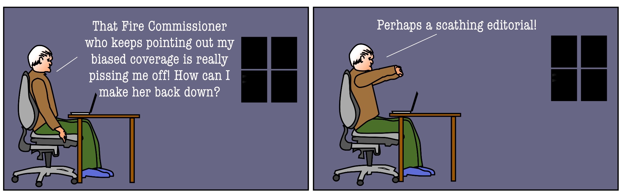 “A couple of years ago, fire commissioner Bill Meursing invited the undersigned to join him for a cup of coffee and essentially asked the newspaper to join the fire department glee club. What I explained to him, apparently unsuccessfully, was that while the newspaper was happy to provide editorial support to the fire department, it was the role of the newspaper to keep an eye on the commission to make sure they were discharging their duties in the public interest.”